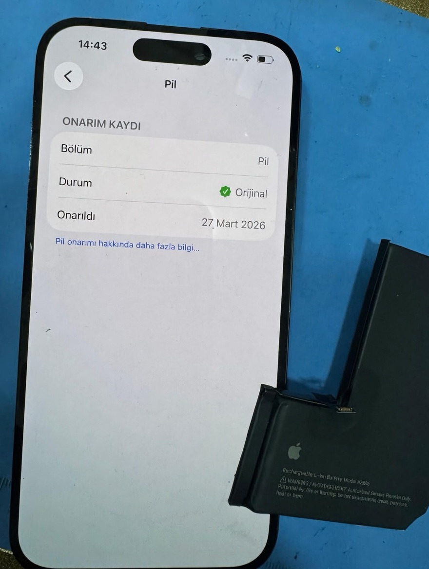 Müşterimiz için 15 Pro Max batarya satın alıp montajını yaptık. Cihaz takıldıktan sonra ayarlarda orijinalliğini direkt doğruladı. Herhangi bir sorun yaşamadık ve müşterimize sorunsuz şekilde teslim ettik. Memnun kaldık, destek olması için yorum ve görsel bırakıyorum iyi çalışmalar.